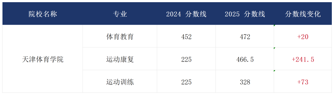 天津体育学院:整体上升,运动康复专业涨 241.5 分(2024:225→2025:466.5)。