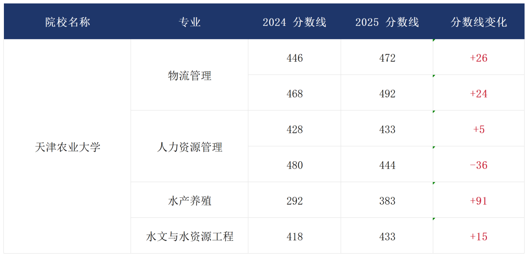 天津农业大学:整体上升,水产养殖学专业涨 91 分(2024:292→2025:383)。