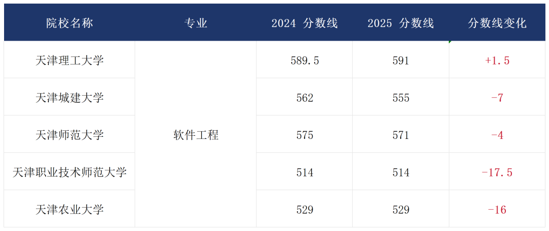 天津大学软件学院:整体分数下降,如天津职业技术师范大学对应专业 2025 年较 2024 年降 17.5 分。