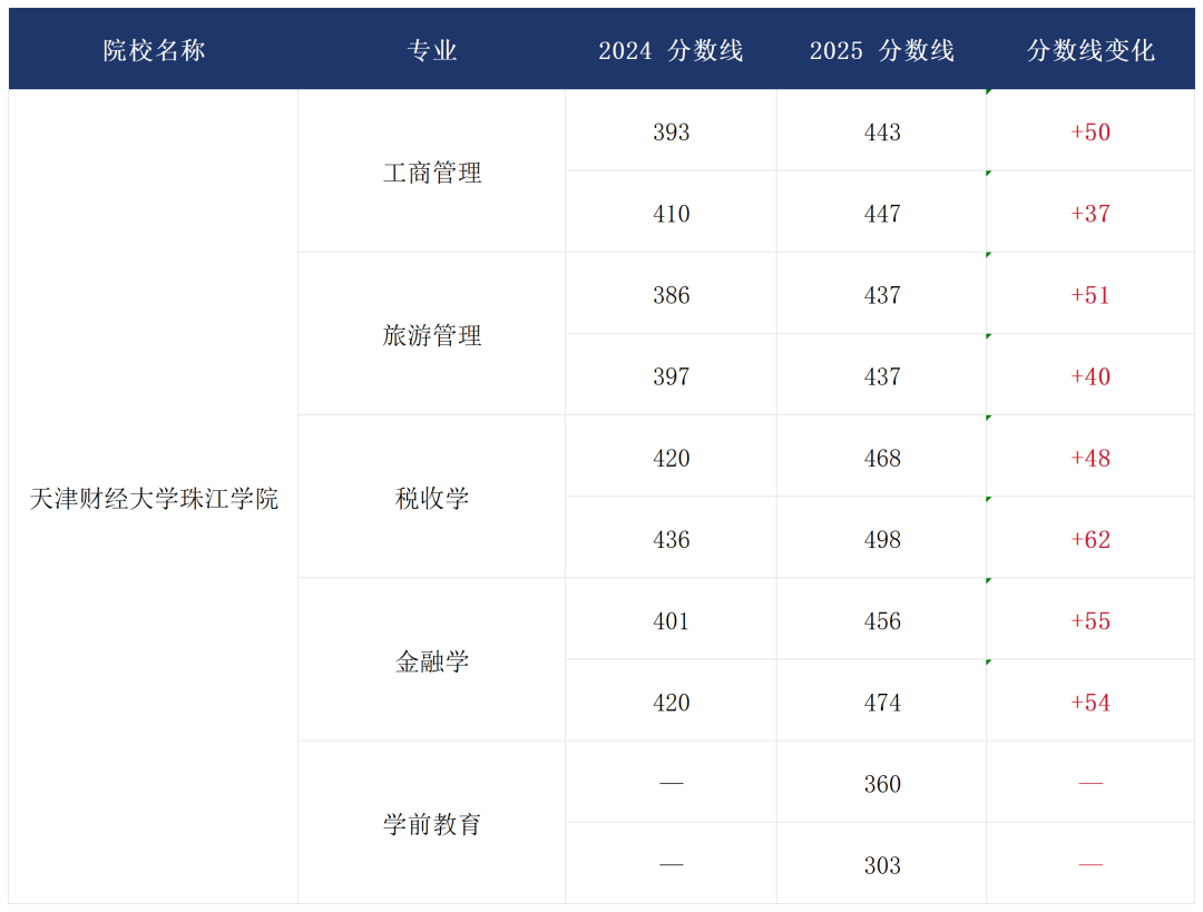 天津财经大学珠江学院:整体上升,各专业涨 30-55 分(如工商管理涨 50 分)。