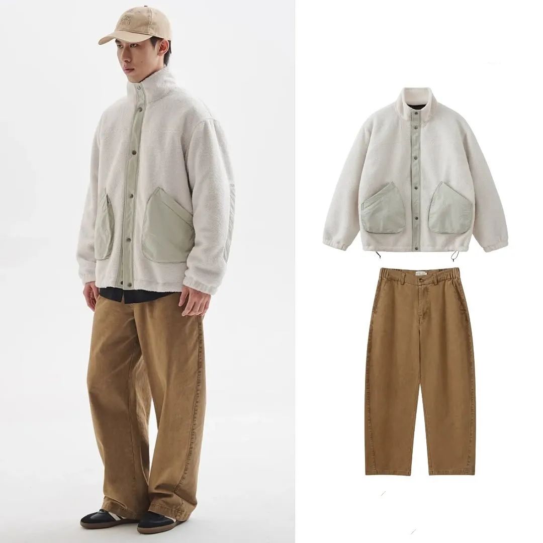 搭配要点:白色摇粒绒外套,保暖亲肤。内搭黑色衬衫,沉稳神秘,形成经典黑白配。驼色直筒裤线条流畅,中和黑白硬朗,尽显优雅。搭配黑色潮鞋,时尚百搭。