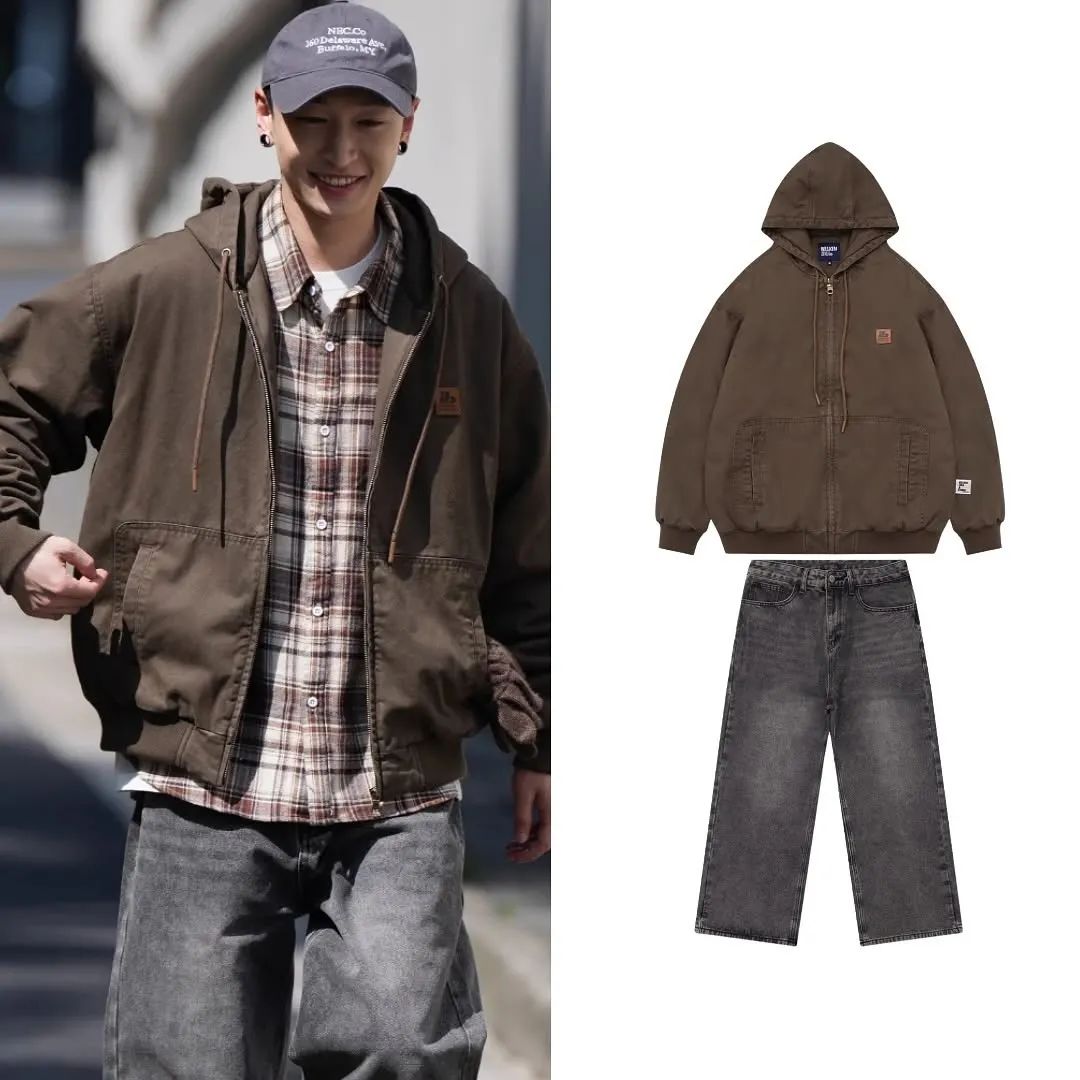 搭配要点:棕色连帽夹克自带温暖与休闲感,帽子实用随性。内搭格子衬衫,复古文艺,丰富层次。灰色牛仔裤百搭且修饰腿型,与上装适配。白色板鞋简约清爽,提亮整体造型。