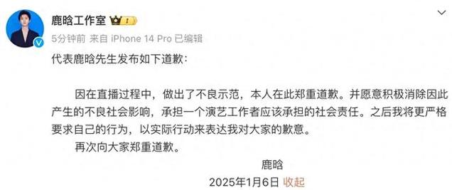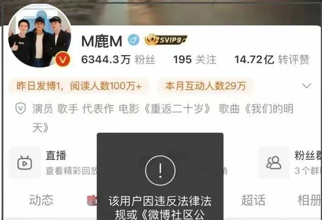 鹿晗社交账突遭全网禁止关注,冲上热搜,很快鹿晗工作室发布公开道歉函,称鹿晗因在直播过程中做出了不良示范,给社会产生了不良影响,向社会公开道歉。