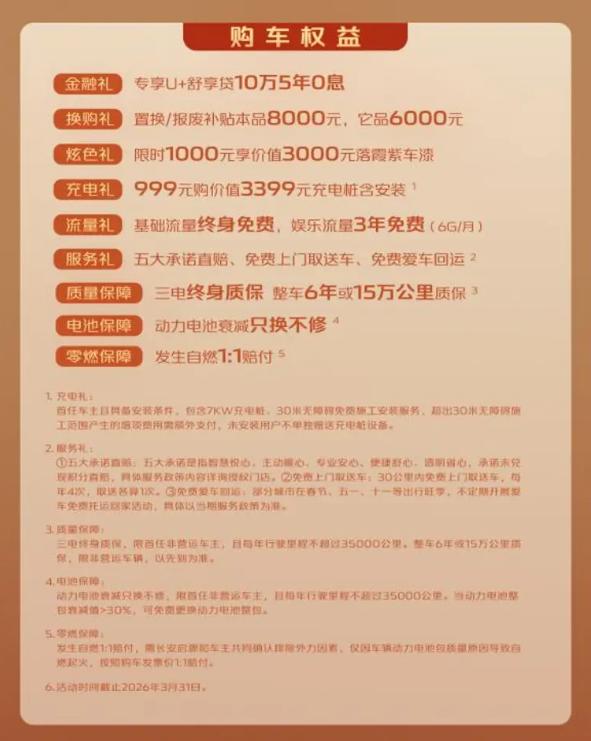 此外,官方同步推出金融礼、换购礼、炫色礼、充电礼、流量礼、服务礼6项诚意大礼及3大安心保障(质量保障、电池保障、零燃保障),活动截止时间为3月31日。