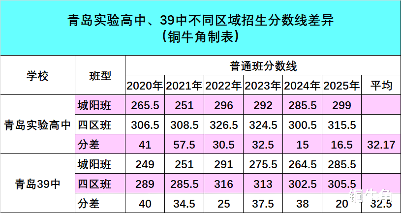 2017年青岛5所局属高中外迁,其中青岛实验高中、青岛39中落户城阳区,并面向城阳区域招生。据统计,过去6年,这两所学校“城阳班”与“四区普通班”的分数线存在显著差距——青岛实验高中平均分差约32.17分,青岛39中平均分差约32.5分。