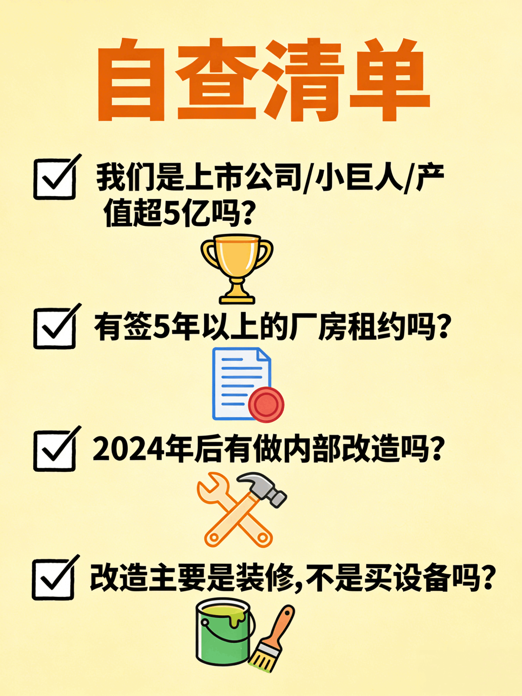 简单说,就是鼓励你租个大点的、好点的厂房,签个长期合同(至少5年),然后按照自己生产或研发的需要,对厂房里面进行“量身定制”的改造装修。
