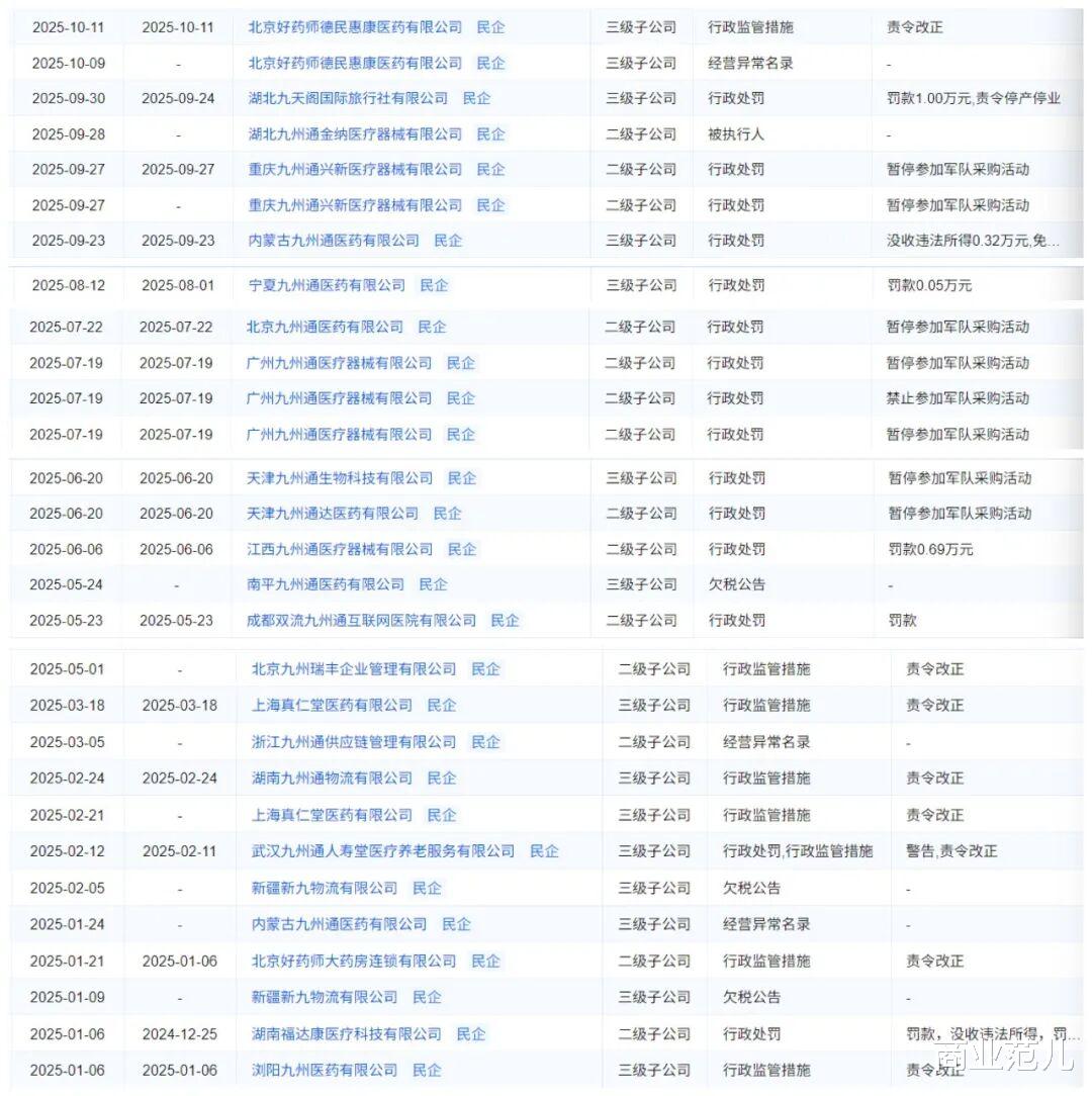 企业预警通显示,仅2025年1月至10月,据不完全统计,九州通旗下多家子公司涉及的违法违规行为约20项。