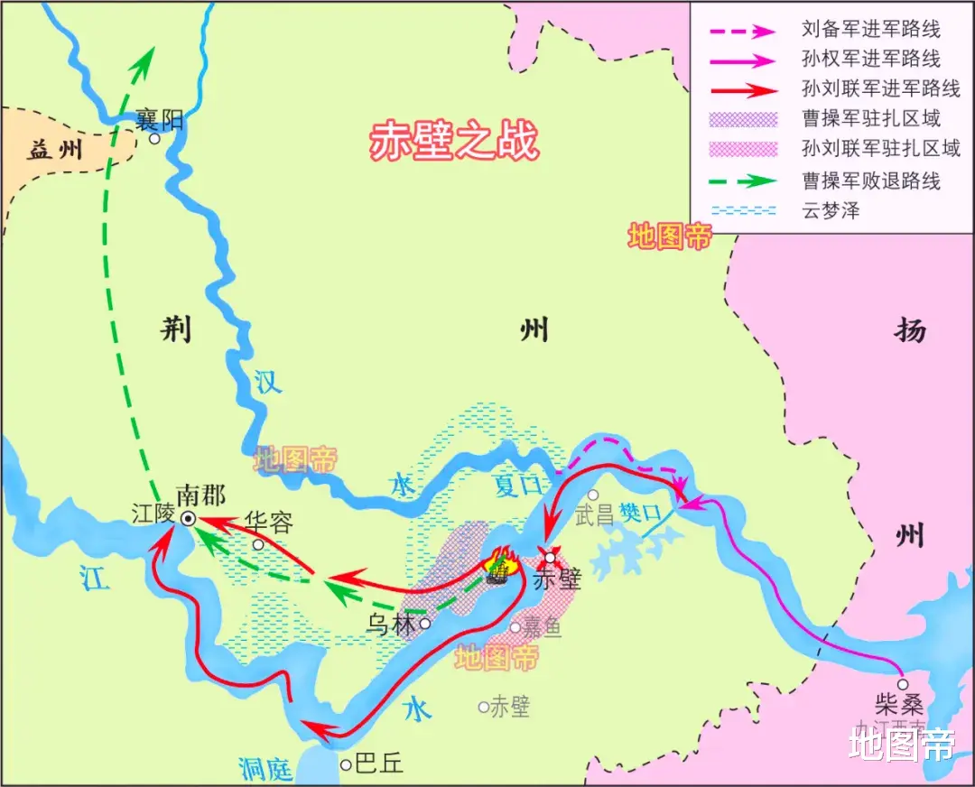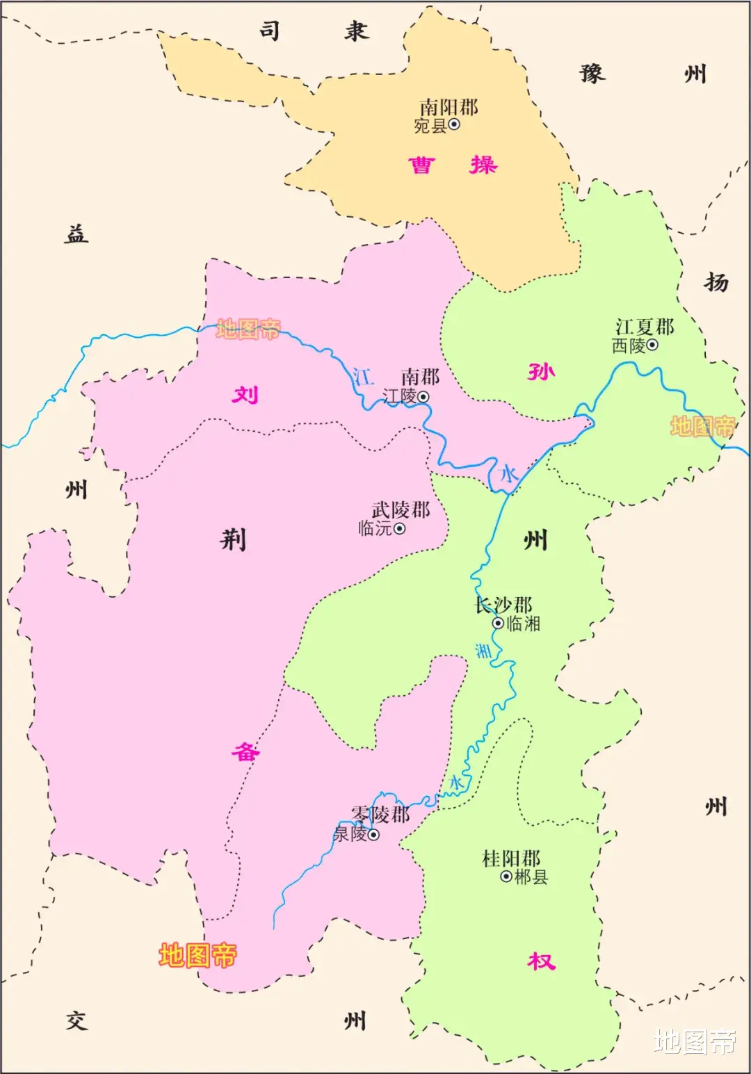 几年后,已控制中原的曹操占领荆州,几乎将刘备和孙权逼入绝境。接着孙刘联盟在赤壁打败曹操,孙权巩固了对江东的统治,刘备则占据荆州南四郡长沙、武陵、零陵、桂阳,控制今湖南省大部分区域。