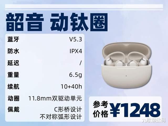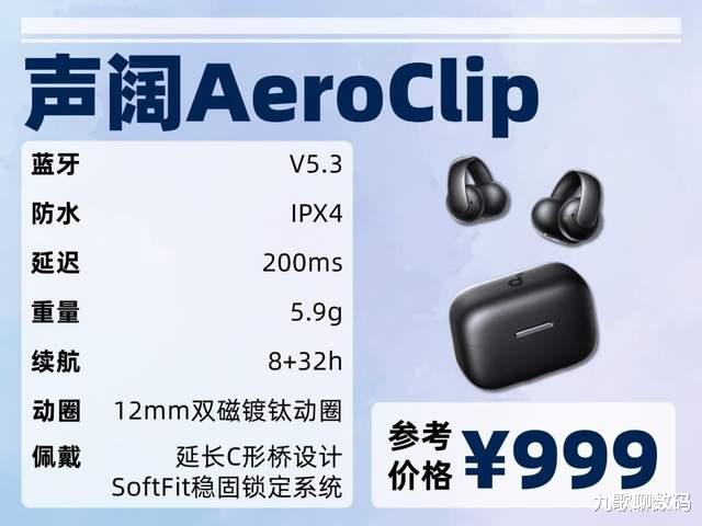 佩戴上环扣设计新颖独特,45 度工学夹角契合耳部轮廓,中间超软硅胶柔性带自适应调节。大耳小耳都适配,久戴无压迫感,运动时也稳固。但 7+19.5h 续航偏短,应对长时间使用稍显吃力。到手价常在千元以上,综合性能,总体性价比一般 。