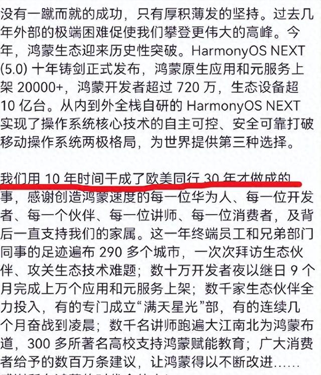 近日,华为常务董事、终端BG董事长、智能汽车解决方案BU董事长余承东发表的内部信曝光,在信中,余承东肯定了华为手机、智能穿戴以及鸿蒙智行四界所取得的成绩,同时也肯定了鸿蒙HarmonyOS NEXT (5.0) 十年铸剑的进步,直言鸿蒙OS用10年干成了欧美同行30年的事,非常值得肯定。