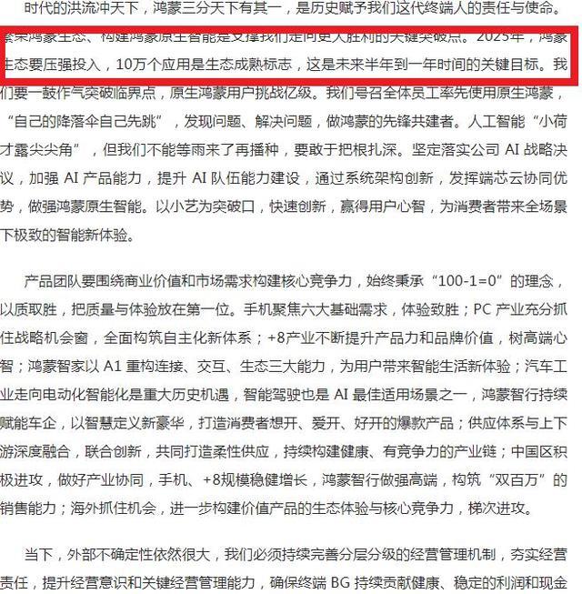 此外,在信中,余承东还提到,鸿蒙生态要加强投入,10万个应用是生态成熟标志,这将是华为接下来半年和一年的奋斗目标。并且还要坚决落实公司的AI 战略决议,给消费者带来更加极致的体验。