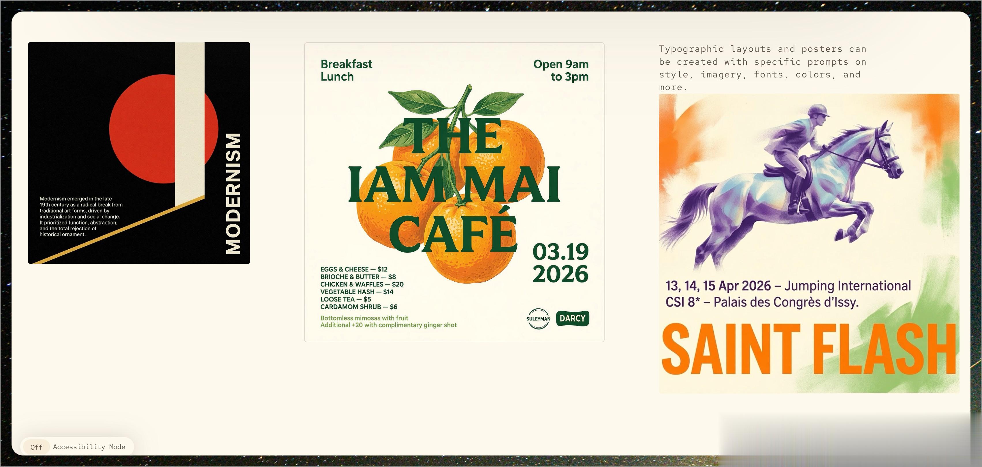2.图片内的文字渲染这是个老问题了。DALL-E 画什么都行,唯独文字一塌糊涂,经常生成一堆乱码。这次有明显改进,菜单、海报、标语这类带文字的画面能看了。