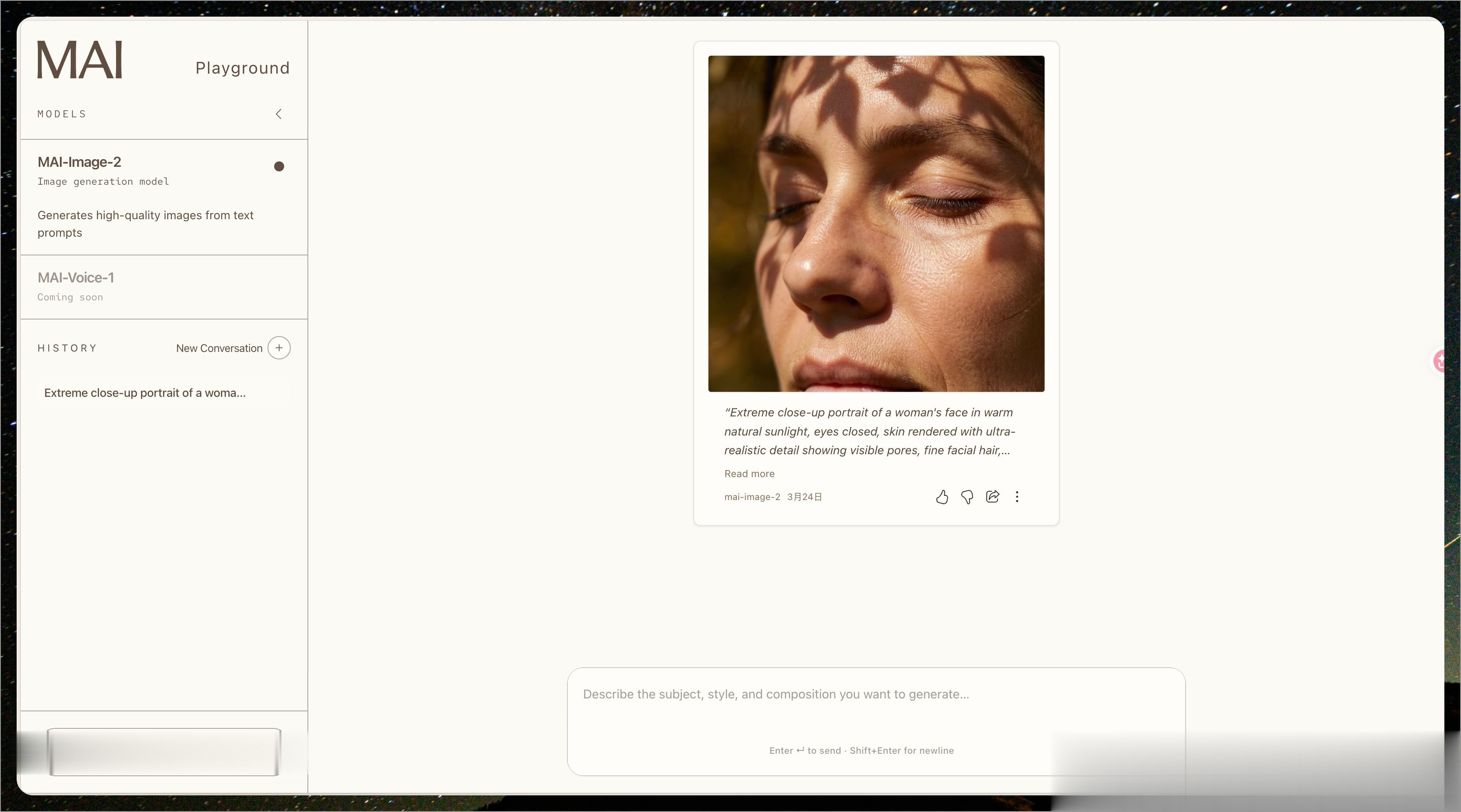 微软这次没有只发一个模型了事。而是上线 MAI Playground 平台,让大家可以直接在网页上使用最新的 MAI-Image-2: