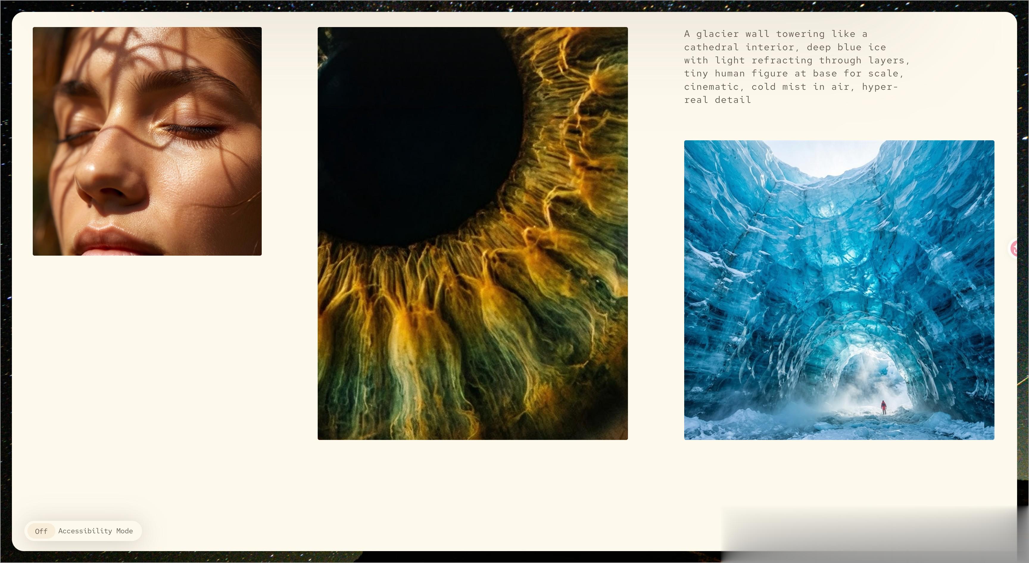 1.照片级真实感官方给出的示例图质量非常高,比如冰洞里的人物、逆光下的皮肤纹理、眼睛里的光线反射。这些过去AI最容易被看穿的场景,MAI-Image-2 处理得相当自然。