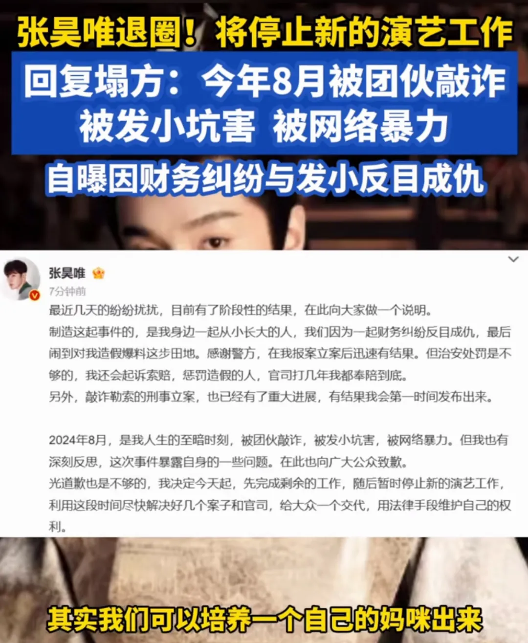 说自己是被团伙敲诈、发小坑害和网络暴力了。