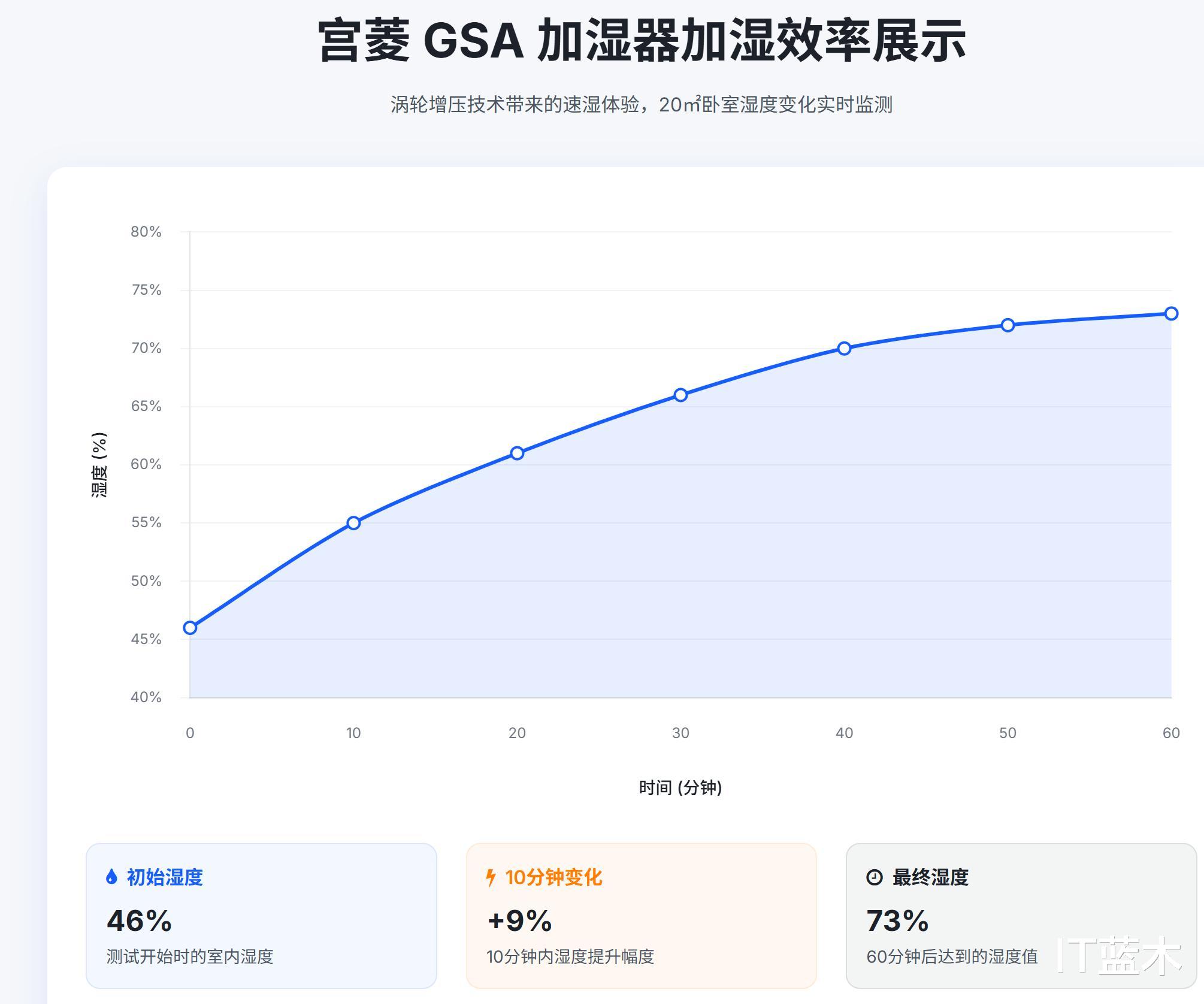 加湿效率是衡量加湿器性能的核心,宫菱 GSA 在实测中表现惊艳。为了直观感受一下宫菱加湿器的加湿效率,蓝木记录初始湿度值为46%,接下来每隔10分钟记录卧室(20㎡)的湿度变化,并将其变化绘制为折线图,可以看出室内的湿度上升很快,不到十分钟室内湿度达到55%,一小时达到73%,快速缓解了皮肤与呼吸道的干燥感。