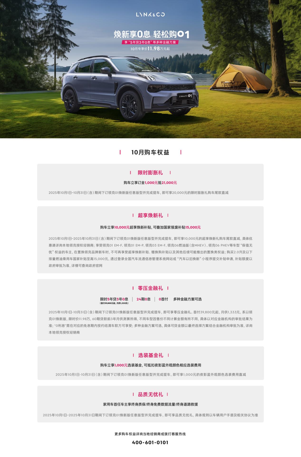 讲完产品力,必须得说说十月的购车福利。领克01焕新版限时11.98万元起,现在下订交1000元订金就能抵21000元,相当于直接省了2万块。还能叠加10000元超享焕新补贴,如果家里有旧车报废,再加上15000元国家报废补贴,算下来能省不少钱。