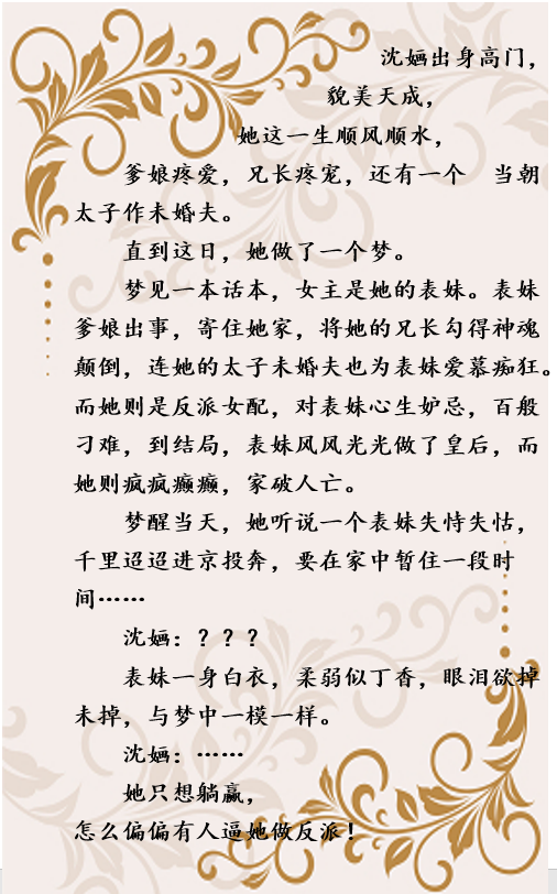 沈婳自出生起顺风顺水,直到有一天她做了个梦,梦见自己身处话本之中,女主是她的表妹,而她则是反派女配,对表妹心生妒忌,百般刁难。