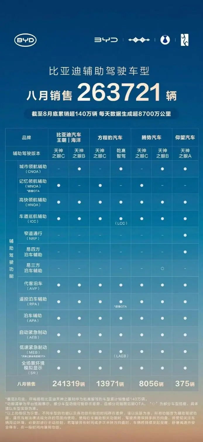 注:截至8月底,所有搭载比亚迪天神之眼和华为智能智驾的车型累计销售超140万辆;功能清单为平台性能展示,部分车型功能可能存在差异,且部分功能需后期OTA,具体以车型实际搭载为准;天神之眼全系后续可OTA升级。