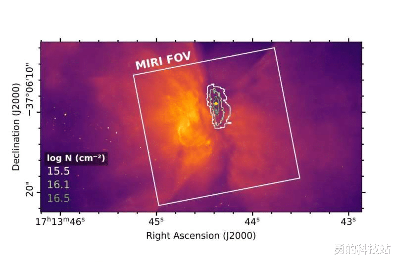 NGC 6302中二氧化碳冰的位置。图像显示了HST/WFC3观测,采用滤镜F656N,追踪氢-α发射。JWST MIRI拼接图用白色框架表示。轮廓显示气相二氧化碳柱密度,左下角显示对应的对数N值(厘米)。图片来源:arXiv