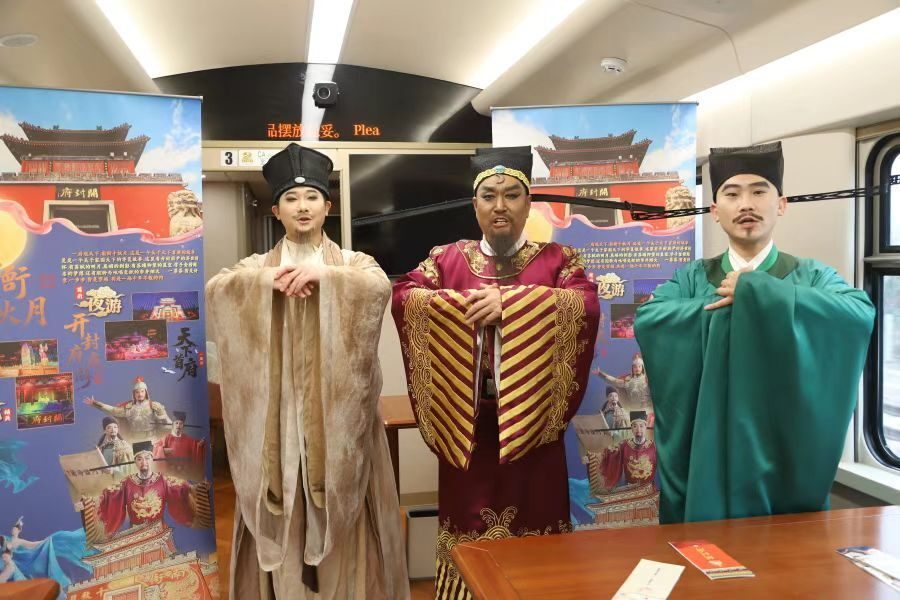 登上列车,专业演员扮演的“包公”再现“天下首府”的庄严气度,与旅客亲切互动;“苏轼”等真人NPC则在车厢中吟诗作对,以经典诗词邀旅客共品宋韵雅意。整趟列车犹如一座“移动文化剧场”,让旅客在有限的旅途时光中尽情享受文化的魅力。