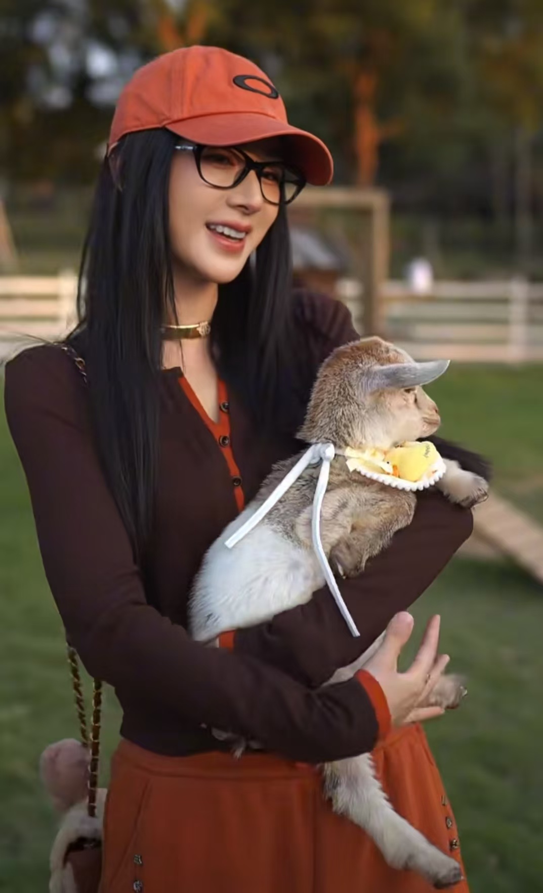 怀里抱着长有2支犄角、身披黄棕+纯白的拼色小羊,薇娅也是嗨起来了。