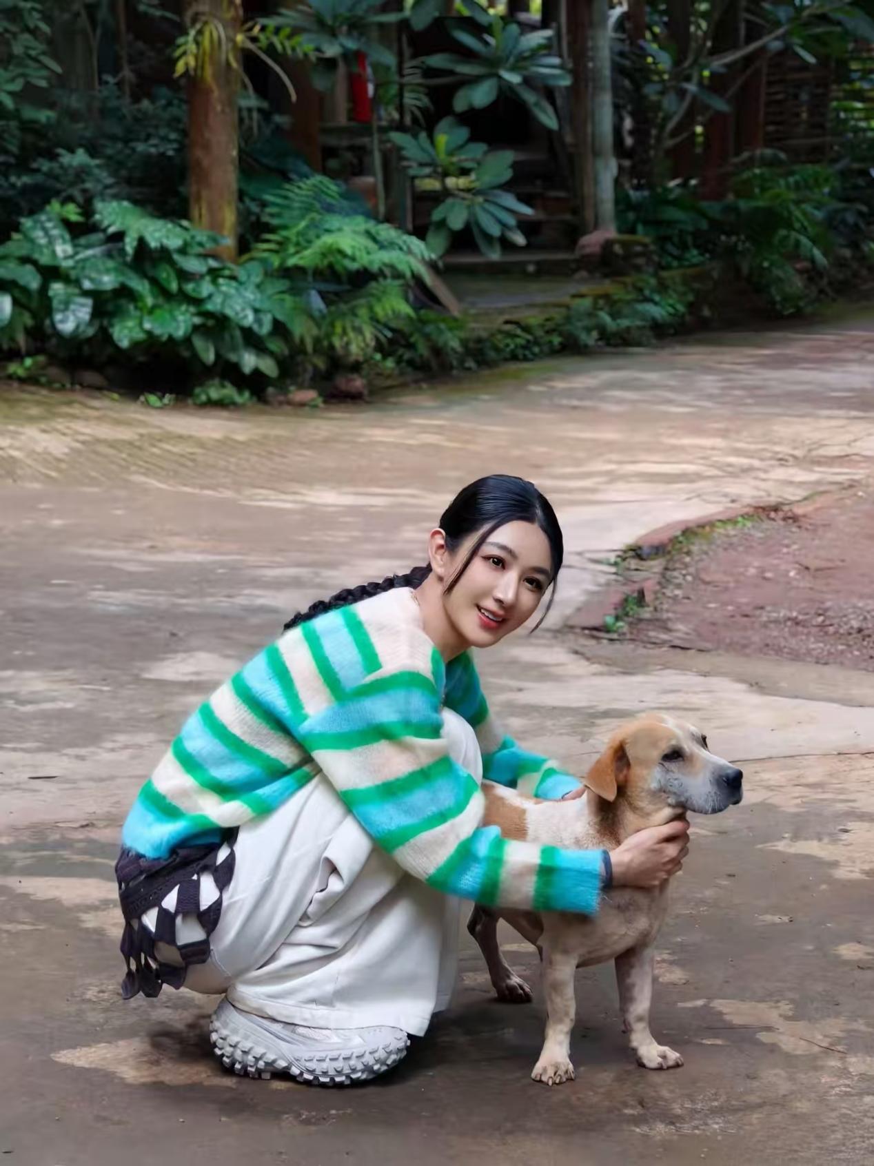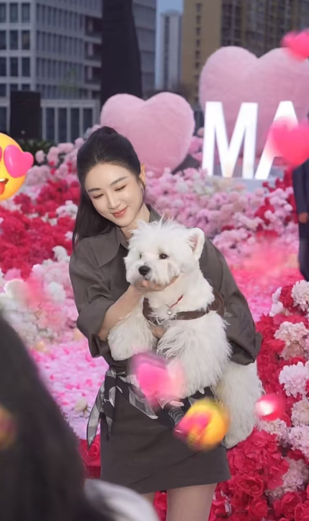 脖子上挂着银铃铛、一身白色长毛的狗狗仿佛知道有人在抓怕它与女神的同框,立马摆好POSE,留下值得回忆的瞬间。