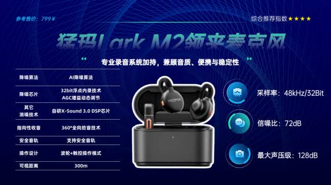猛玛LARK M2主打隐形无感佩戴与抗干扰收音属性,针对移动拍摄、日常Vlog场景做了相应设计。单麦仅重7g,采用钛合金夹持结构,可横竖双向夹持,佩戴隐形不突兀,机身无外露LOGO,适配多种轻薄衣物。