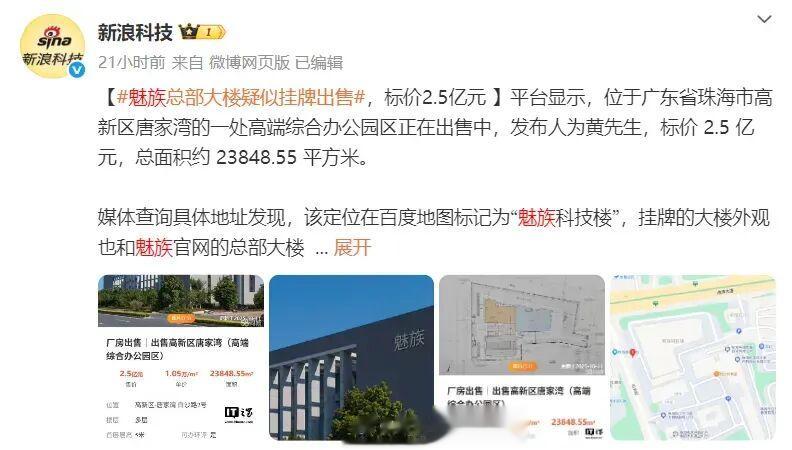 @新浪科技 日前报道,平台显示,位于广东省珠海市高新区唐家湾的一处高端综合办公园区正在出售中,发布人为黄先生,标价 2.5 亿元,总面积约23848.55 平方米。