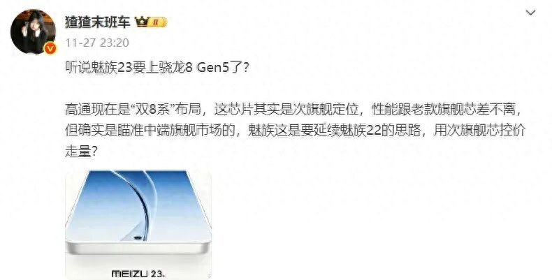 按照该博主的说法,魅族23将搭载骁龙8Gen5处理器,预计定位次旗舰。