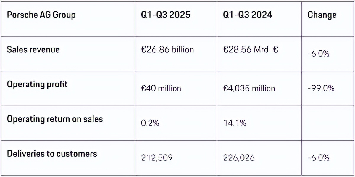 2025 年 10 月 24 日,德国斯图加特当地时间上午 9 点(北京时间下午 3 点),保时捷三季度财报准时披露。当 “前三季度销售利润 4000 万欧元” 的数字跳出来时,连长期跟踪的分析师都愣住了 —— 要知道,去年同期这个数字还是 40.35 亿欧元,一年时间竟暴跌 99%,营业利润率从 14.1% 跌到只剩 0.2%。更让人意外的是股价,当日收盘 34.81 欧元,较 2022 年上市时 82.5 欧元的发行价,直接腰斩近 58%。那个曾靠 911 车型日赚千万、被称为 “豪车印钞机” 的保时捷,怎么突然就 “不赚钱” 了?