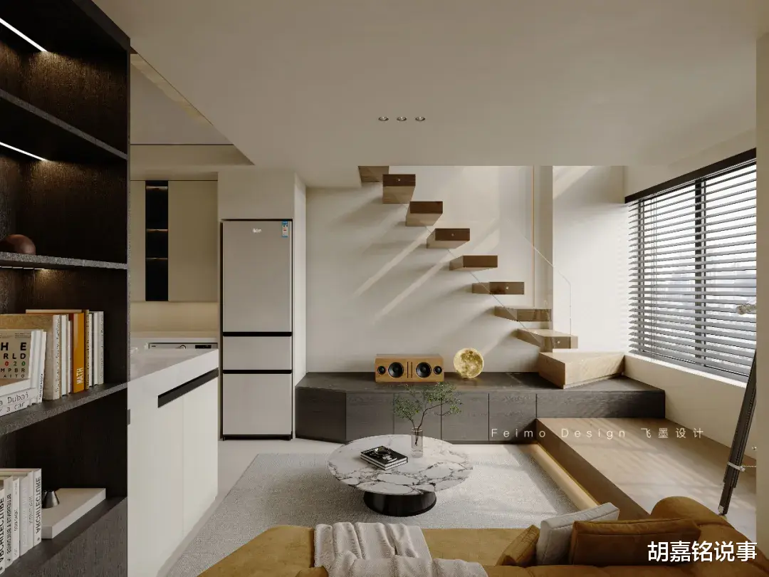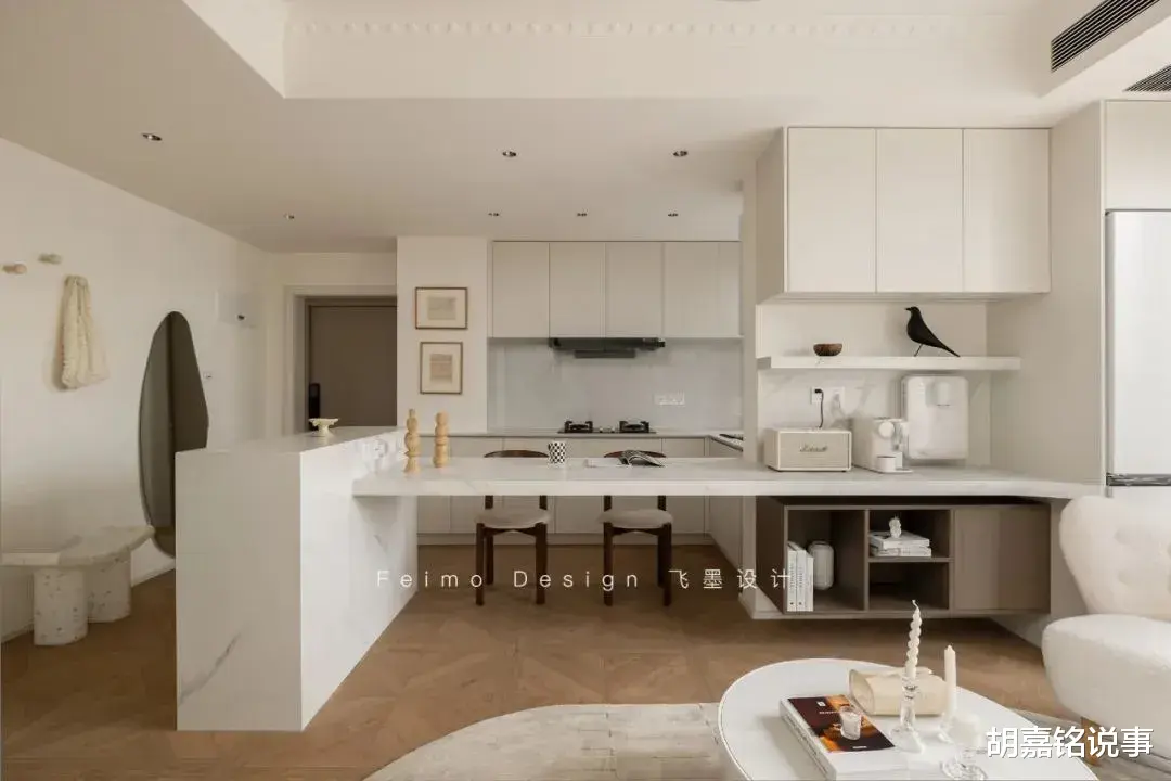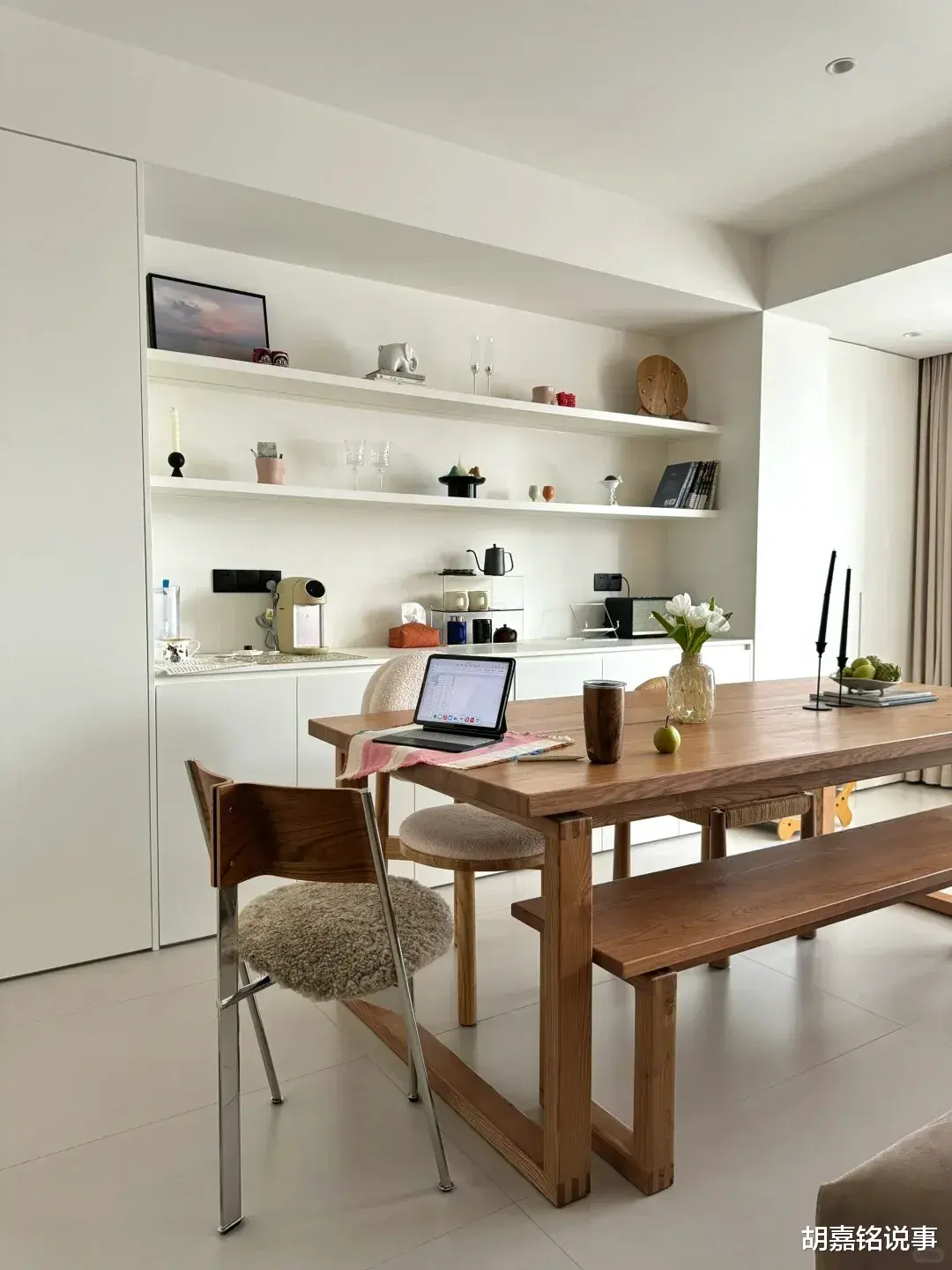 ✅可以做客厅+餐厅+厨房一体化,打掉非承重墙,用吧台/透明玻璃做软隔断,空间简单放大一倍。