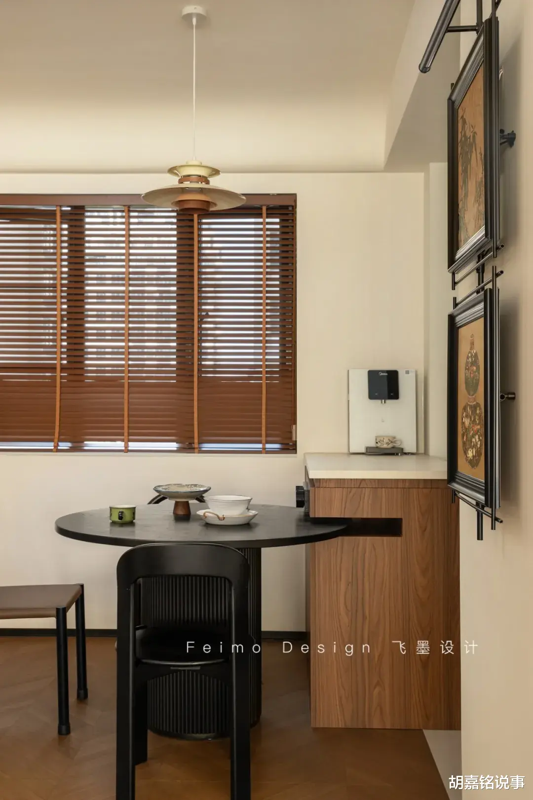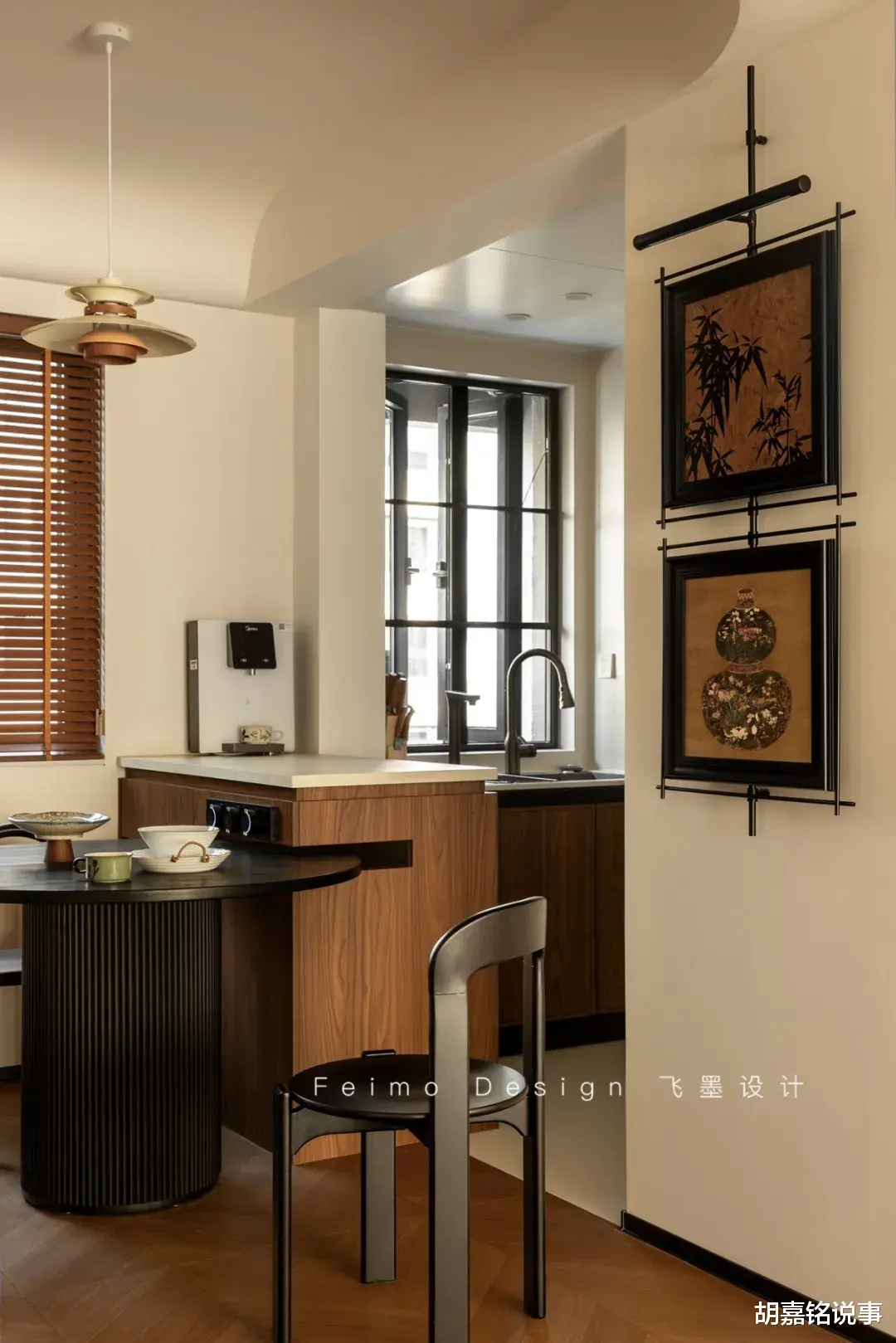 小户型同样可以做岛台,甚至可以外移部分厨房功能,解决现在户型厨房越做越小的问题。小圆桌和岛台做嵌入式处理,更好留出过道空间。