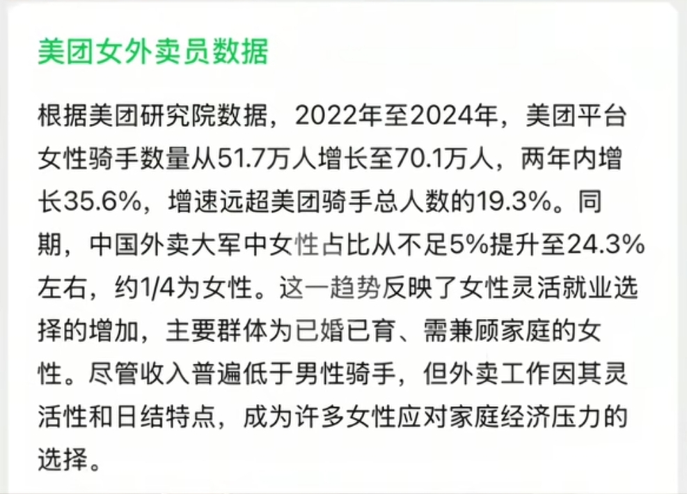 美团的数据在那儿摆着呢,2022年-2024年,女骑手直接涨了36%,增加了70多万人了。2025年只会更多,这个增速比男性快多了。