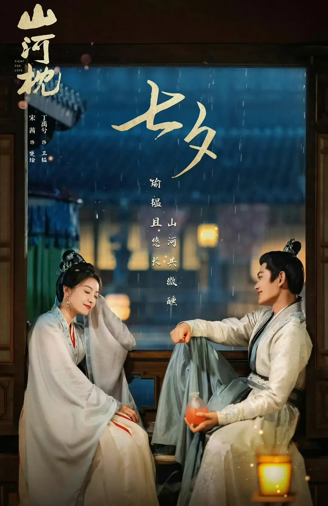 《花开锦绣》是丁禹兮和邓恩熙继《长乐曲》之后的二搭,两人经过两部戏的磨合已经非常有默契了。即使一个是95生,一个是05花,年龄差距大,看起来也很有cp感。丁禹兮的另一部剧《山河枕》也放出了七夕物料。海报里,宋茜凭栏假寐,状态松弛;丁禹兮手里拿着一壶酒,嘴角含笑。看起来就很有故事感。
