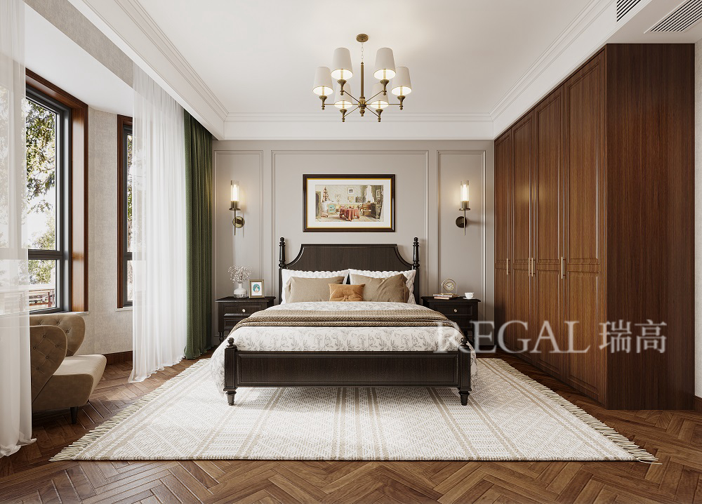 本案色彩方面,以暖色调为主,护墙板结合壁布的墙面,给人温馨、柔和之感,仿佛阳光轻柔地洒入室内。搭配深棕色的实木家具,雕花的衣柜,尽显沉稳与质感。其间再点缀以挑色的抱枕、窗帘等软装,恰似一抹清新的微风,平衡了整体色调,增添了灵动气息。