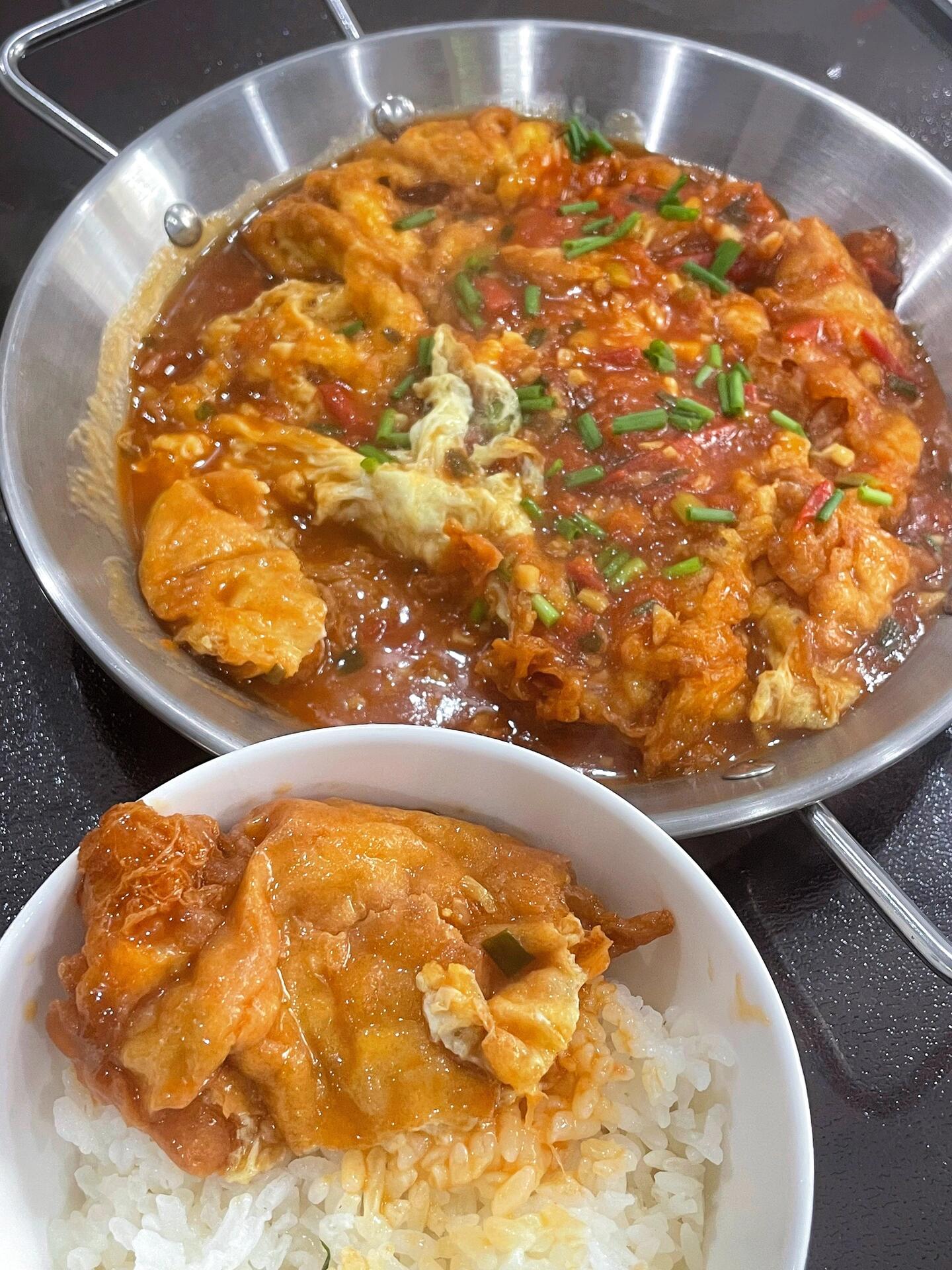 茄汁炸蛋,可以说是番茄鸡蛋的天花板了,汤汁浓郁,口感丰富,炸蛋吸满了汤汁,吃一口简直不要太幸福,下饭界的扛把子。