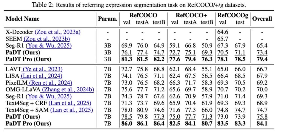 PaDT 的实验结果堪称惊艳。在 RefCOCO/+/g 的指代表达理解(REC)任务上,PaDT Pro(3B)以 93.6 的平均准确率,超越了参数量高达 78B 的 InternVL3(91.4)。而在指代表达分割(RES)任务中,PaDT 同样大幅领先,即便对比使用 SAM 等强大分割基础模型的方法(如 Text4Seg+SAM),依然保持优势。