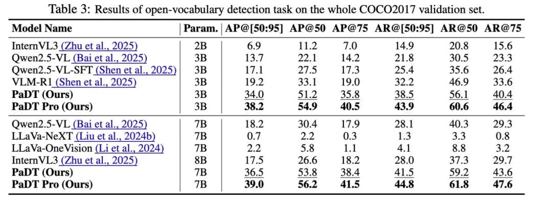 更令人震撼的是在 COCO 开放词汇检测任务上的表现。传统 MLLMs 在此任务上 mAP 普遍低于 20,而 PaDT Pro(3B)一举将 mAP 推高至 38.2,几乎翻倍! 7B 版本更是达到 39.0 mAP,展现出极强的可扩展性。
