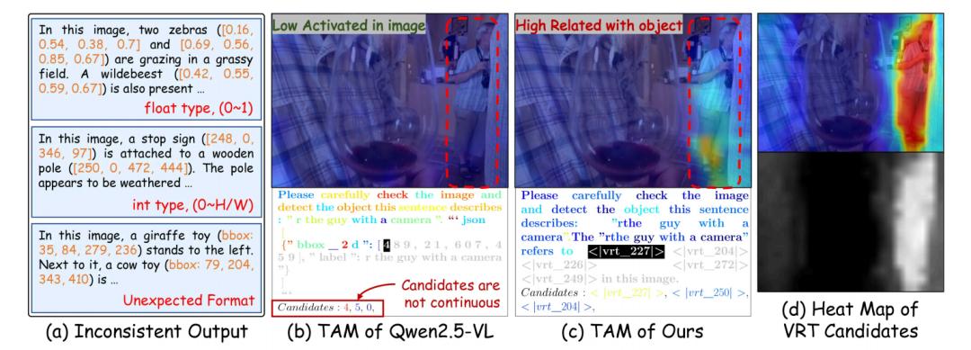 图 1:(a) 传统方法输出格式混乱;(b) Qwen2.5-VL 的 Token Activation Map 显示坐标 token 与图像区域关联弱;(c) PaDT 的 VRTs 与目标区域高度对齐;(d) 单个 VRT 的热力图显示其预测具有空间连续性。