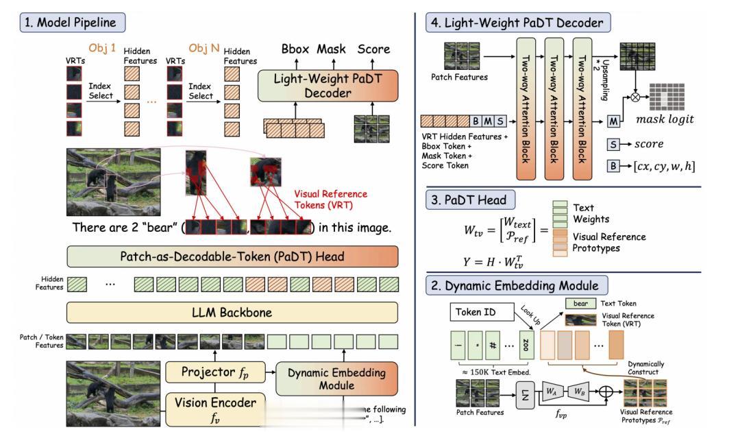 图 3:PaDT 整体框架。图像 patch 特征经动态嵌入模块扩展为 VRTs,与文本 token 一同输入 LLM;输出序列中的 VRTs 被轻量解码器转换为结构化视觉结果。