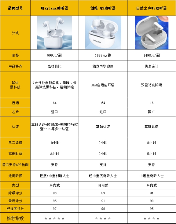 测评结果:町石>创维>自然之声町石助听器音质测评表现整体听感还挺不错的,声音清楚又比较自然。不管是跟朋友聊天还是听音乐,人声听起来挺立体的,层次感也够。清晰度、真实度、细腻度都还不错,基本没什么明显瑕疵。 我自己戴着试的时候发现,即使周围有点嘈杂,人声也不会被背景声“淹没”,能比较容易分辨出来。它用了SCS人声多层增益和双磁铁动铁单元技术,加上高密度移频处理,所以整体感觉声音有点立体,也不算平面。听一会儿,发现声音的厚度和清晰度都让我挺意外的。创维助听器音质测评表现整体来说表现还行,人声比较清楚,也算自然。中高频细节做得还可以,听乐器和人声的时候分辨度比一般款好一点。它有多频段平衡算法和动态增益调整,算是有加分的小技巧。 不过低音就一般般,厚度没町石那么足,有时候觉得声音有点单薄。整体日常聊天或者听音乐差不多够用,但要追求那种细腻感,可能就稍微差点意思。自然之声助听器音质测评表现音质中规中矩,清晰度和真实度都属于普通水平。 中高频的人声还是可以接受,基本上听日常对话没啥问题。它用了简单的频段调节和回声抑制技术,算是稳稳地完成任务。 不过细节不多,低音平淡,声音厚度和立体感不够,长时间听音乐或者声音复杂一点就容易觉得平。整体来说,就是一种稳重、不出彩的感觉,中规中矩而已。