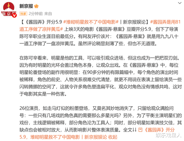 这也正是新京报所指出的关键问题——“堆砌明星救不了中国电影”。当一个项目更注重谁出演、谁上热搜,而不是故事讲得是否扎实、角色是否立体时,即便台前全是演技派,也救不了一部本质空洞的剧本。甚至为了照顾番位,还要人为调整剧情重点,这就更让人出戏。