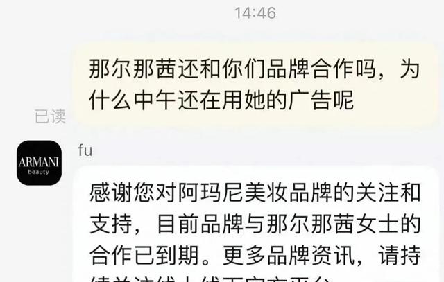 阿玛尼美妆回应,跟那尔那茜合约已经到期。