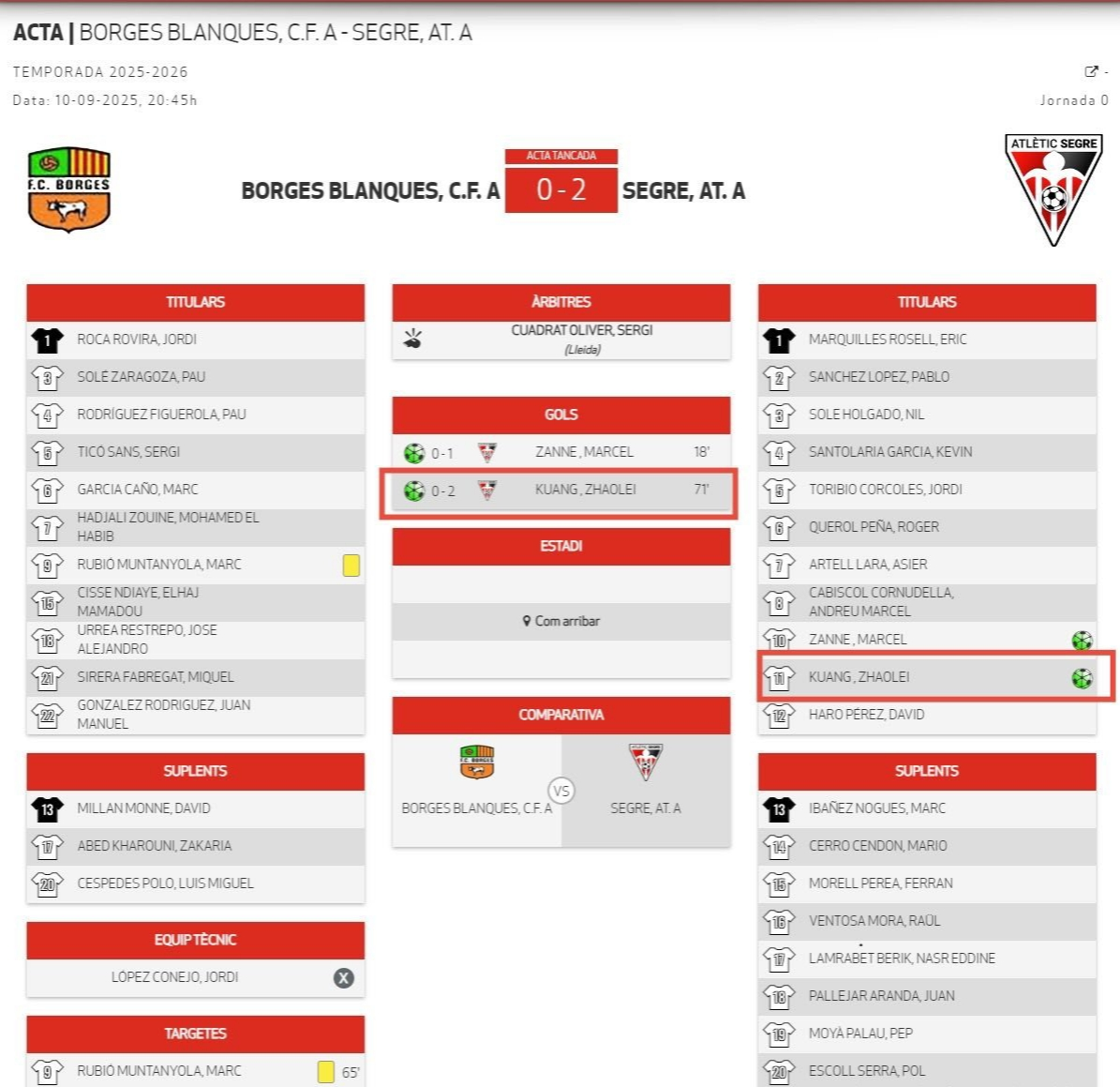 2025年9月14日,据知名博主“莱斯特城的小狐狸”报道,比利亚雷亚尔U16A队6-1大胜莱万特U16队,15岁的中国留洋球员刘凯源首发出场并取得进球;热身赛,塞格雷竞技U19A队2-1莱里达省AGRAMUNT镇队,16岁的中国球员邝兆镭1人独进2球,帮助球队取得了胜利。2名中国留洋球员2场进了3球,这对于中国足球来说是个好的消息,至少让人看到了一些希望。