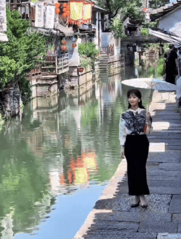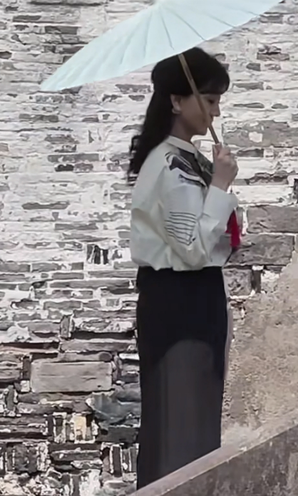 当天,赵雅芝穿着一件水墨花纹衬衫,搭配黑色高腰裙,手里撑着一把油纸伞,走在湿漉漉的青石板路上,微风一吹,她那一头长发轻轻飘动,真的太有氛围感了!
