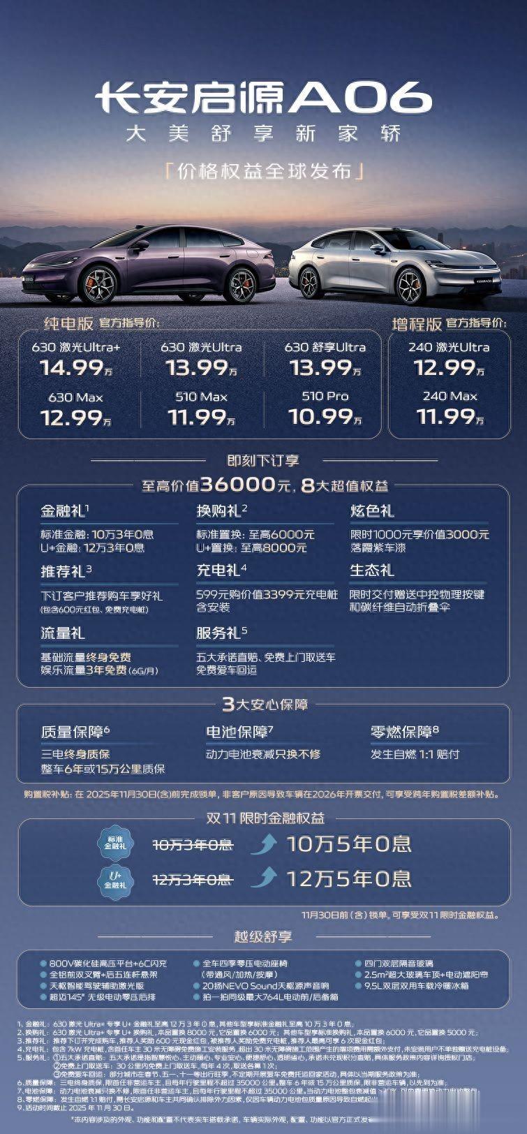 为回馈用户支持,长安启源还推出多重购车礼遇,下订即可享受8大超值权益,至高价值36000元。双11活动之际,长安启源还特别针对11月30日前锁单的用户,升级了限时金融权益,购车可享10万5年0息;其中630激光Ultra+车型更可享12万5年0息!