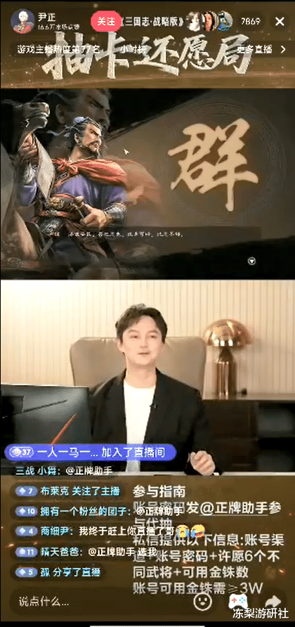 比如大家都知道的“袁华”尹正,那可是三战的资深玩家。帮玩家充值抽卡同样是不在话下,属于是常规操作。有一次尹正直播帮玩家抽到两张心愿的SP卢植卡,感觉比他自己抽到还激动,甚至“国粹芬芳”都不小心脱口而出,哥们嘴上说着自己是“非酋”,但那小表情完完全全就像那种欧气爆棚还爱嘚瑟的损友!