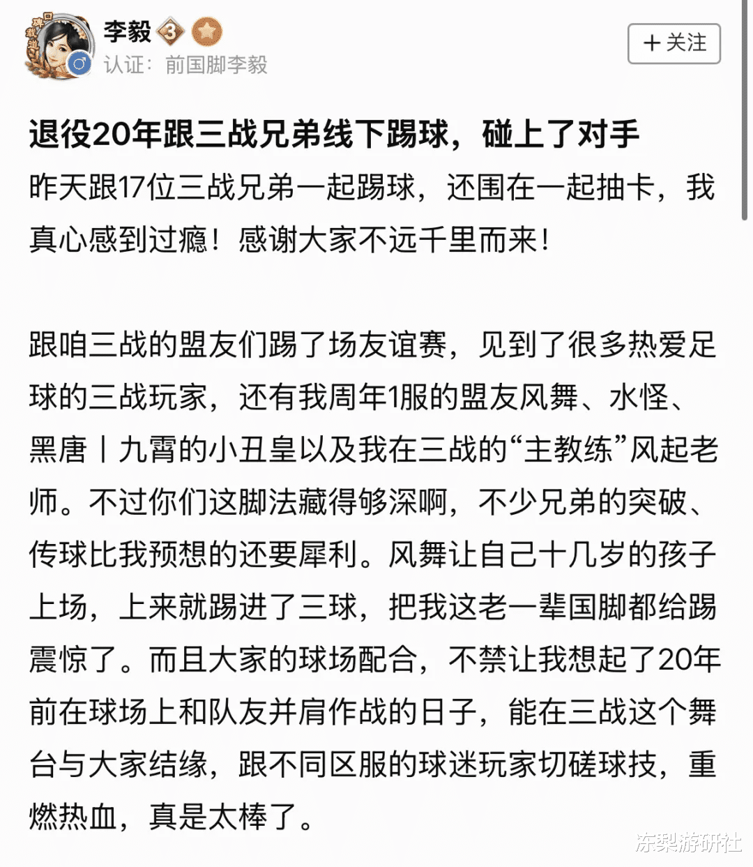 这可不是什么商业联赛,李毅的对手也不是职业球员,而是和他在游戏《三国志·战略版》里并肩作战的同盟兄弟们。今年三战的打金服宣传的力度不小,但凡是个SLG发烧友应该都有所耳闻,大帝就是因为在打金服拿了“霸业”,作为盟主的李毅一拍大腿:“必须线下庆祝!”于是就有了这场福利拉满到让人眼红的——“每进一球我就给他三战账号充一个648来抽卡”。
