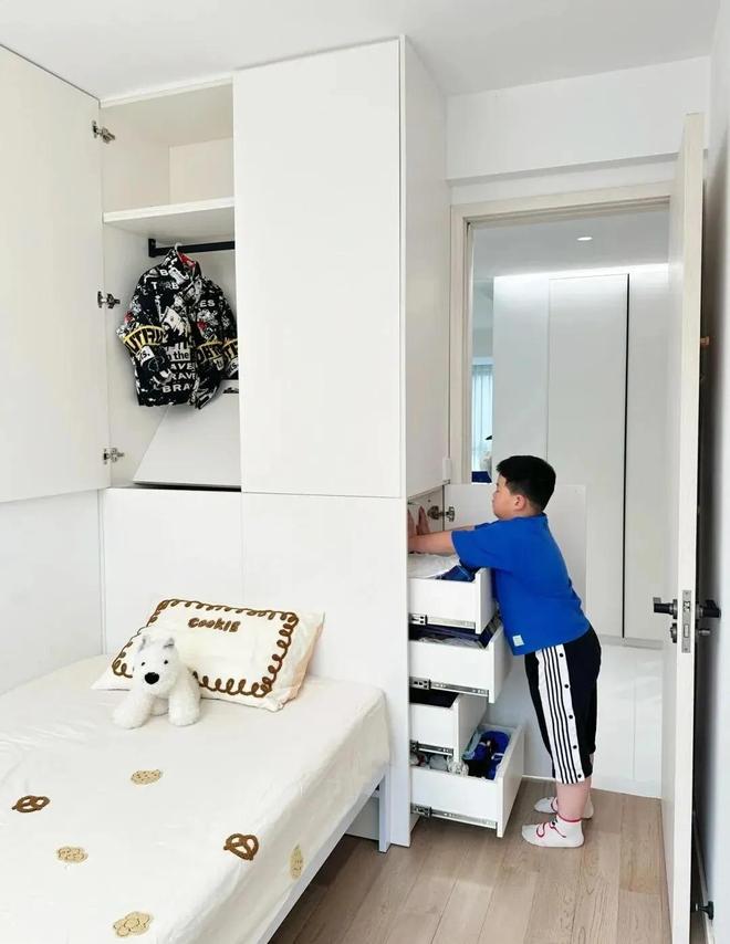 在小房间里,设计一个“多向定制柜”,柜子不同方向打开,有不同的用处,既让小房间的收纳得到充分使用,孩子用着也非常的方便。